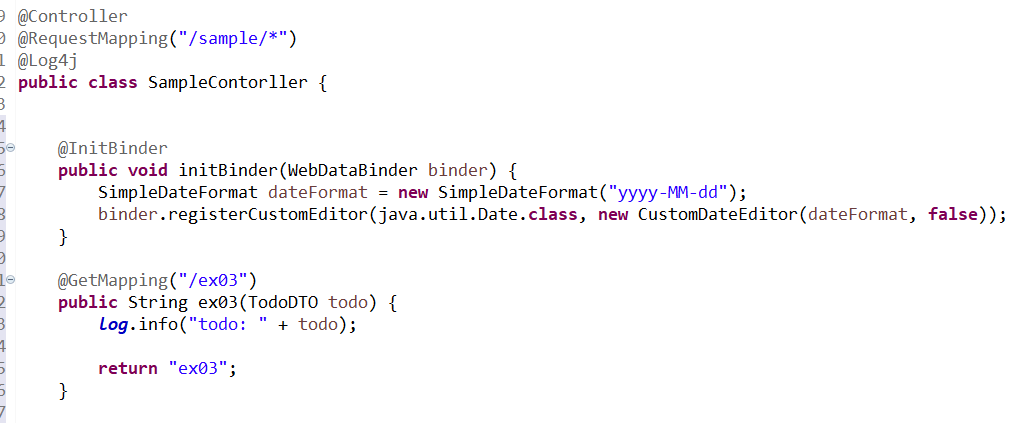스프링5의 Controller에서는 파라미터를 바인딩 할 때 자동으로 호출되는 @InitBinder 어노테이션을 이용해서 이러한 변환을 처리할 수 있다.