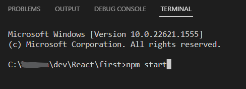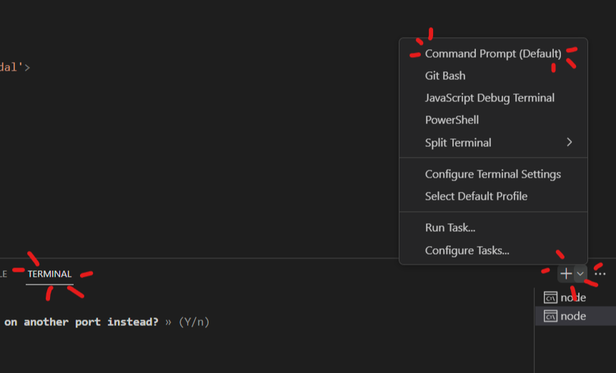 터미널 우측의 플러스 버튼을 눌러 Command Prompt(Default)로 변경한 뒤 다시 작성하면 된다.