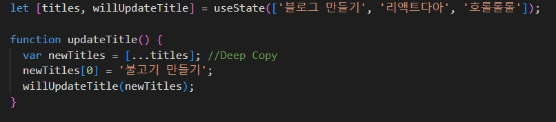 state 데이터를 생성할 땐 대괄호 안에 변수를 담을 변수명(titles)과 그 변수를 수정할 때 쓰일 함수(willUpdateTitle)이 있어야한다. state로 생성된 변수는 tiltes[0] = '불고기 만들기'; 처럼 직접 수정할 수 없다. 무조건 생성될 때 선언한 함수를 이용해 데이터에 접근해야만 수정할 수 있다.