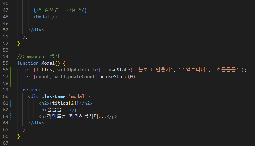 컴포넌트를 호출한 부분에 title 값을 선언 해준다. 그리고 컴포넌트에서 props 객체 인자를 받는데 여기서 props는 { title : titles[2] } 가 되는 것이다.