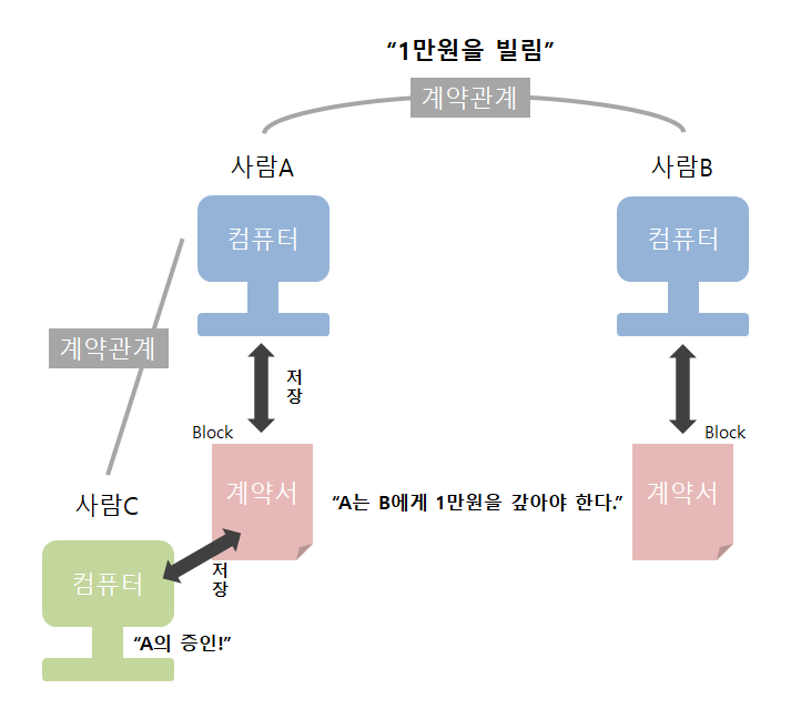 그런데 A가 B와의 거래를 증인 삼아줄(?) C를 영입한다. 둘 사이의 계약이 맺어지고 A가 가지고 있는 B와의 거래 계약서를 C의 컴퓨터에도 저장된다.