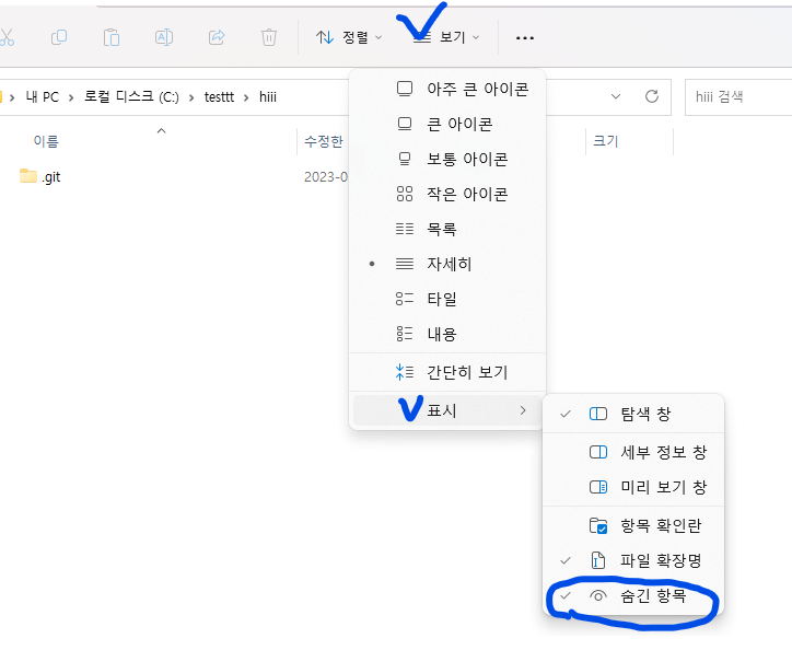 .git 폴더는 반드시 숨긴 항목에 체크 해주어야만 볼 수 있다.