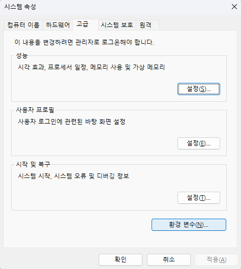 윈도우 검색창에 '시스템 환경 변수 편집'을 검색한다.