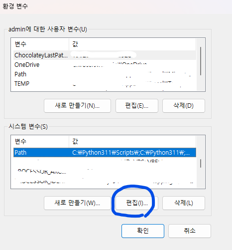 아래 시스템 변수의 Path를 선택하고 편집을 클릭한다.