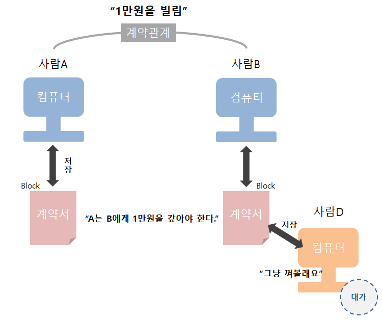 동일한 상황에서 D가 이 거래에 참여하겠다고 한다. D는 A, B, C 그 누구와도 계약을 맺지 않은 채 '내 서버에 그 계약서 저장해~ 제공해줄게~'라는 입장인 것이다.