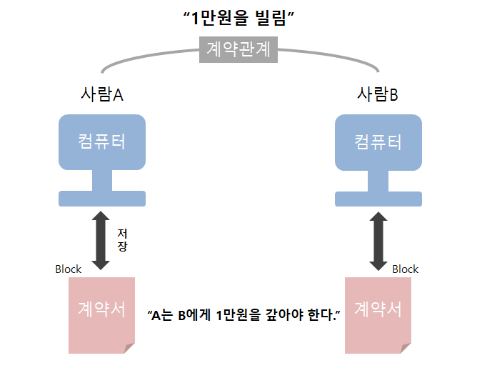 A가 B에게 만원을 빌렸다는 상황이다. 그런데 B는 A를 잘 알지 못해 선뜻 돈을 빌려줄 수 없어 둘은 계약서를 작성한다.