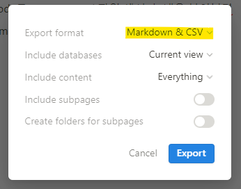 Export 클릭 후 Markdown & CSV 파일로 Export 해준다.