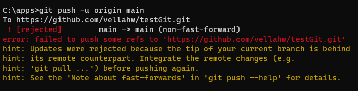 로컬저장소와 원격저장소의 내용이 다를 때 두 저장소를 동기화 시켜줘야한다. 동기화 하지 않은채 커밋하게 되면 위와 같은 오류가 발생하는데 이럴 때 Pull(당기기~~)을 해주어야한다.