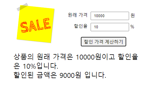 1 2 3 4 5 6 7 8 9 10 11 12 13 14 15 16 17 18 19 20 21 22 23 24 25 26 27 28 29 30 31 32 | <body> <div id="contents"> <img src="images/sale.png"> <ul> <li> <label for="oPrice">원래 가격</label> <input type="text" id="oPrice">원 </li> <li> <label for="rate">할인율</label> <input type="text" id="rate">% </li> <li> <button onclick="showPrice()">할인 가격 계산하기</button> </li> </ul> <div id="showResult"></div> </div> <script> function showPrice() { var originPrice = document.getElementById('oPrice').value; var rate = document.getElementById('rate').value; var savedPrice = originPrice * (1 - (rate/100)); document.querySelector('#showResult').innerHTML = '상품의 원래 가격은 ' + originPrice + '원이고 ' + '할인율은 ' + rate + '%입니다.' + '<br/> 할인된 금액은 ' + savedPrice + '원 입니다.'; } </script> </body> | cs |