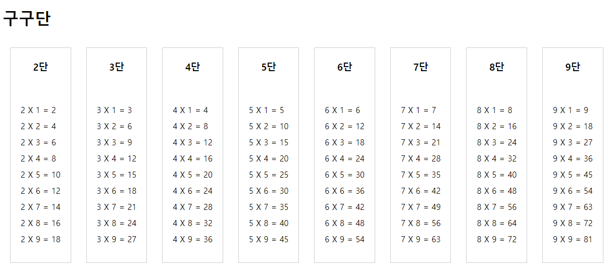 - 화면 구현: 1부터 9까지의 곱셈이 끝나면 <div> 닫히는 구성이기 때문에 '몇 단인지 생성되는 반복문'에서 div를 열어주고 곱셉 반복문 블럭 후에 div를 닫아준다.