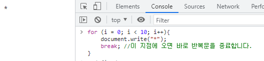 i가 10보다 작을 때까지 반복문을 돌게 되어있지만 break문으로 인해 별은 하나만 출력되고 반복문이 종료된다.