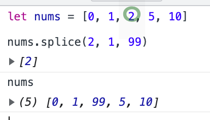 2번째 인덱스 2에서부터 1개를 삭제하고 (해당 인덱스 포함) 99를 배열에 추가한다.
