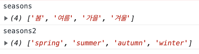하지만 사진과 같이 seansons와 seasons2를 다시 한 번 찍어보면 각 배열이 변경되지는 않았다.