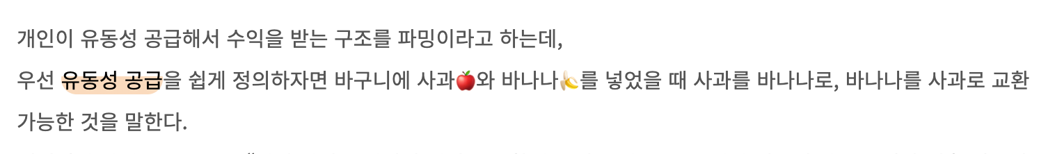 예) $50 A 토큰과 $50 B 토큰을 묶어 A-B: 유니스왑에 유동성 공급 -> 유동성 공급은 '바구니'를 만드는 것