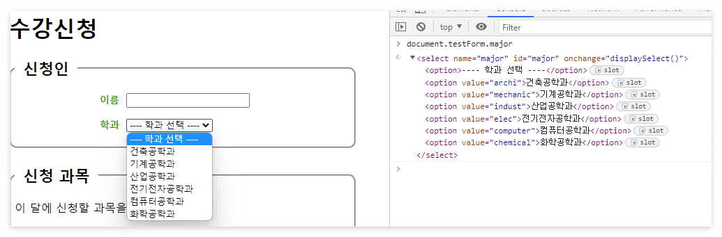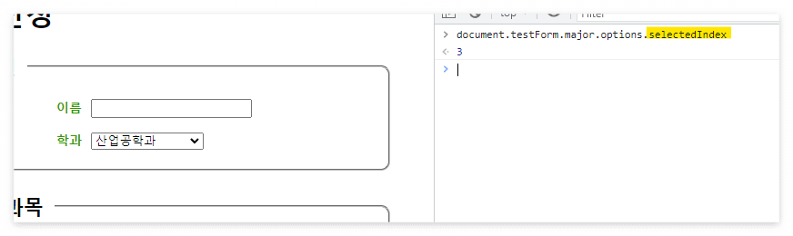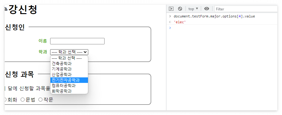 name 속성으로 option 요소에 접근 document.form이름.option요소의이름