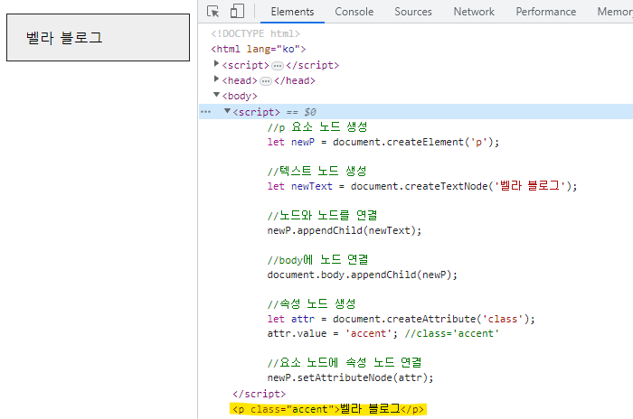 - 속성 노드를 만들 때는 createAttribute()를 사용해 변수에 담은 후 setAttributeNode()로 속성을 추가할 요소 노드에 연결한다.