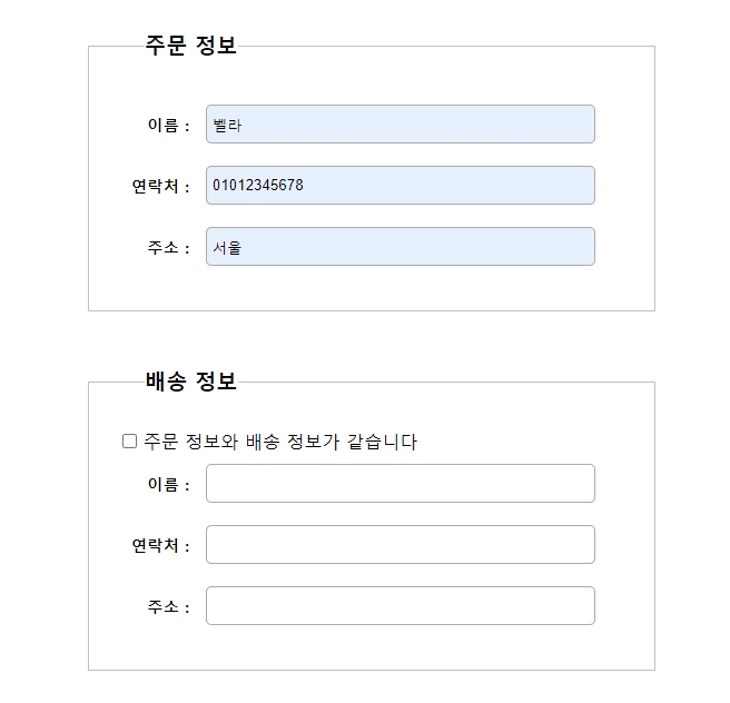 - checked 속성이 true 즉, 체크되었다면 두 input의 값을 갖게 함