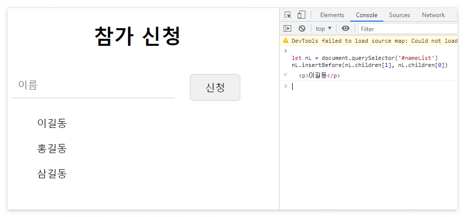 위 참가 신청 코드는 appendChild()를 이용해 노드의 맨 마지막에 새로 입력한 이름이 추가되도록 작성 했지만 insertBefore()를 이용해 아래와 같이 수정하면 새로 입력한 이름이 최상단에 오도록 할 수 있다.