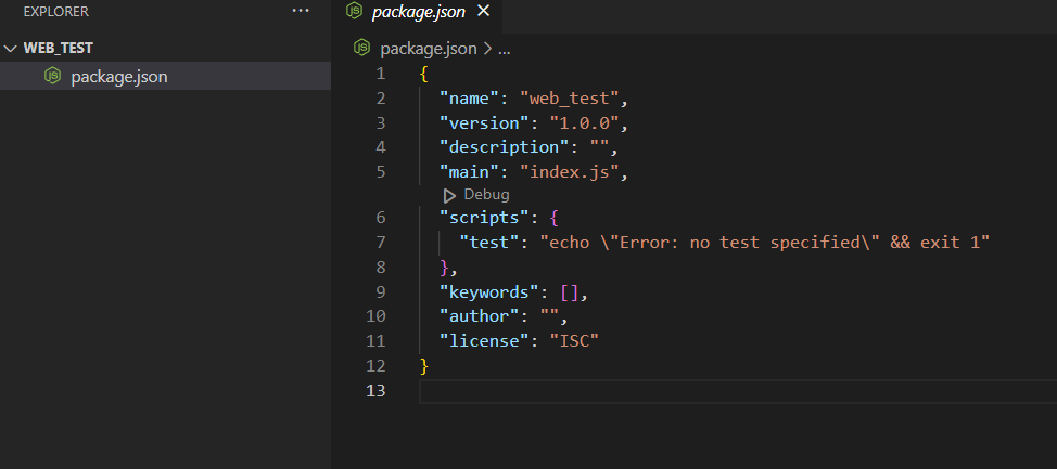위 명령어를 입력하면 package.json 파일이 만들어진다.