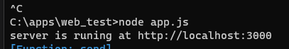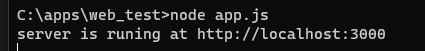 app.js에 서버 생성 메서드를 작성했으므로 cmd에서 app.js를 실행하는 명령어를 입력하면 서버가 실행된다.