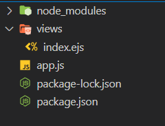 우선 app.js 파일에 위 코드를 추가하고 views 라는 폴더를 생성 후 그 안에 index.ejs 라는 파일을 생성했다. 파일만 생성하고 아무 내용도 작성하지 않았다.