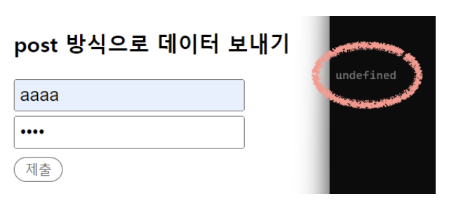 form에 데이터를 입력하고 제출 버튼을 누르면 사진과 같이 undefined가 뜬다.