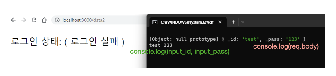 data 라는 이름으로 result 값을 담아주었으니 input에 입력하는 아이디, 패스워드 값에 따라 "로그인 성공" 혹은 "로그인 실패" 문자열이 출력될 것이다.