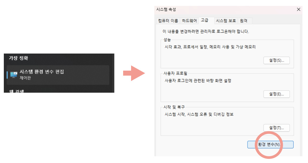 시스템 환경 변수를 검색하고 고급 탭의 환경 변수 버튼을 클릭한다.
