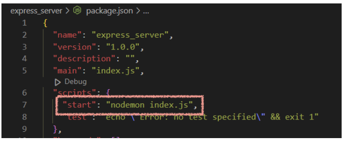 설치가 완료 되었으면 사진과 같이 package.json의 scripts에 "start" : "nodemon index.js" 를 추가한다.