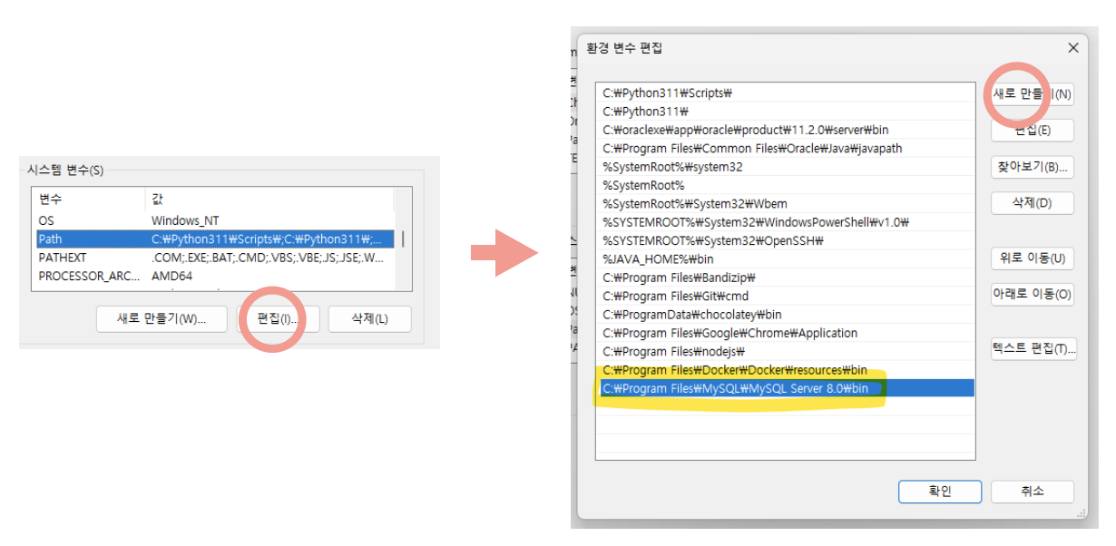 새로 만들기 버튼을 눌러 MySQL이 설치된 폴더 안의 Server 폴더의 bin 폴더 경로를 복사하여 넣어준다.
