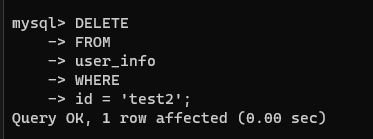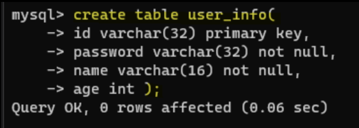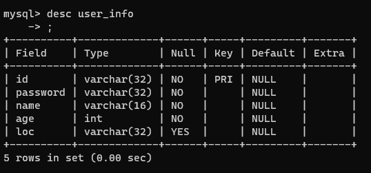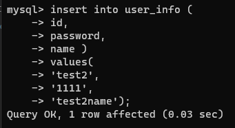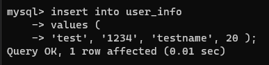 user_info 테이블을 생성할 때 age 컬럼은 null이 허용되도록 설정해주었기 때문에 데이터가 들어가지 않아도 된다.