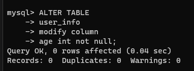 위 쿼리문은 null 허용이었던 age 컬럼을 not null로 수정한 것이다.