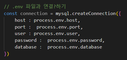 .env 파일을 생성하여 index.js에서 connection 변수에 입력한 내용을 동일하게 작성해준다.