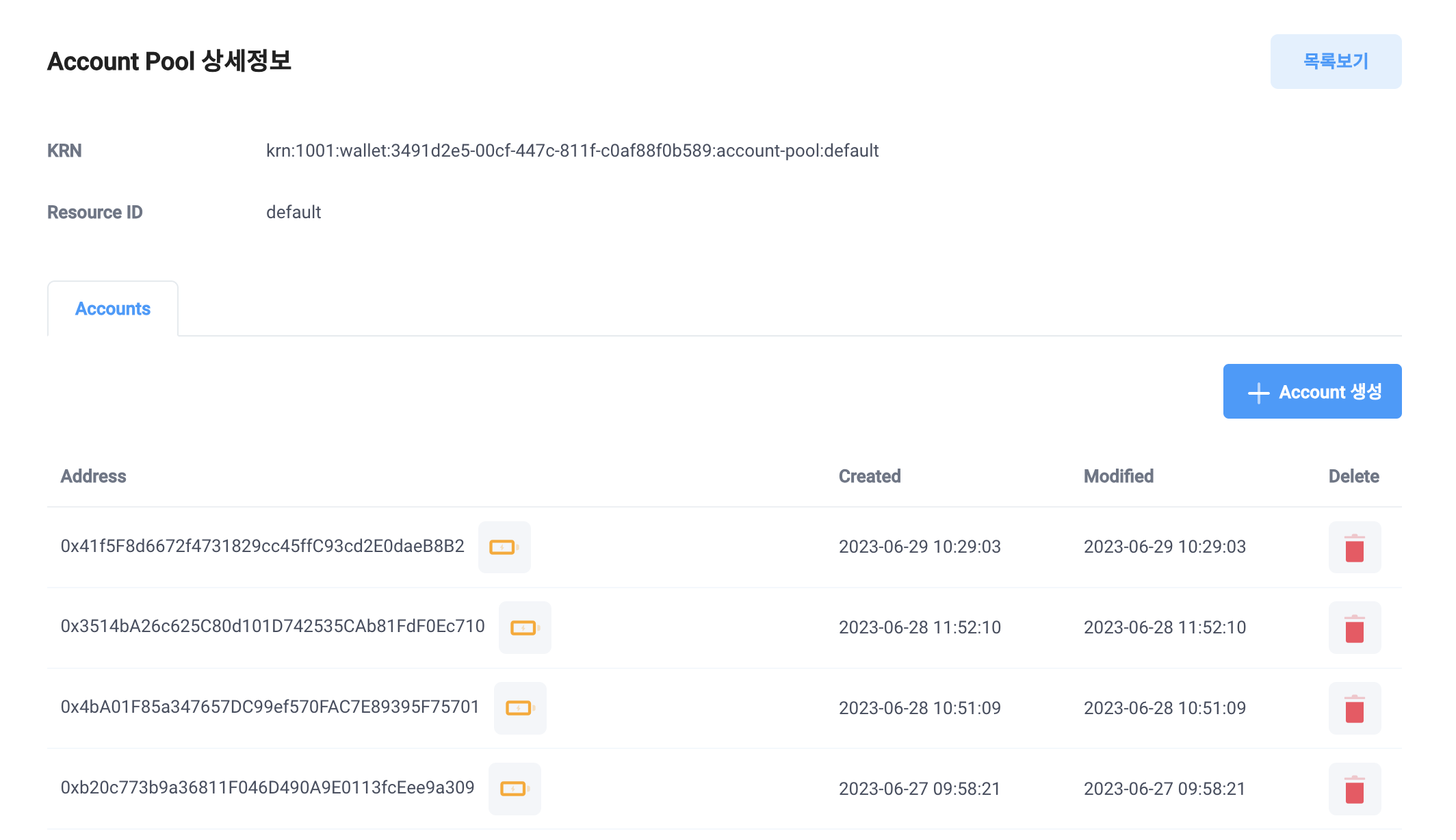 우리는 회원가입을 함과 동시에 유저의 지갑을 만들어주도록 했다. 그 지갑들은 Accounts Pools를 생성하면 확인할 수 있다.