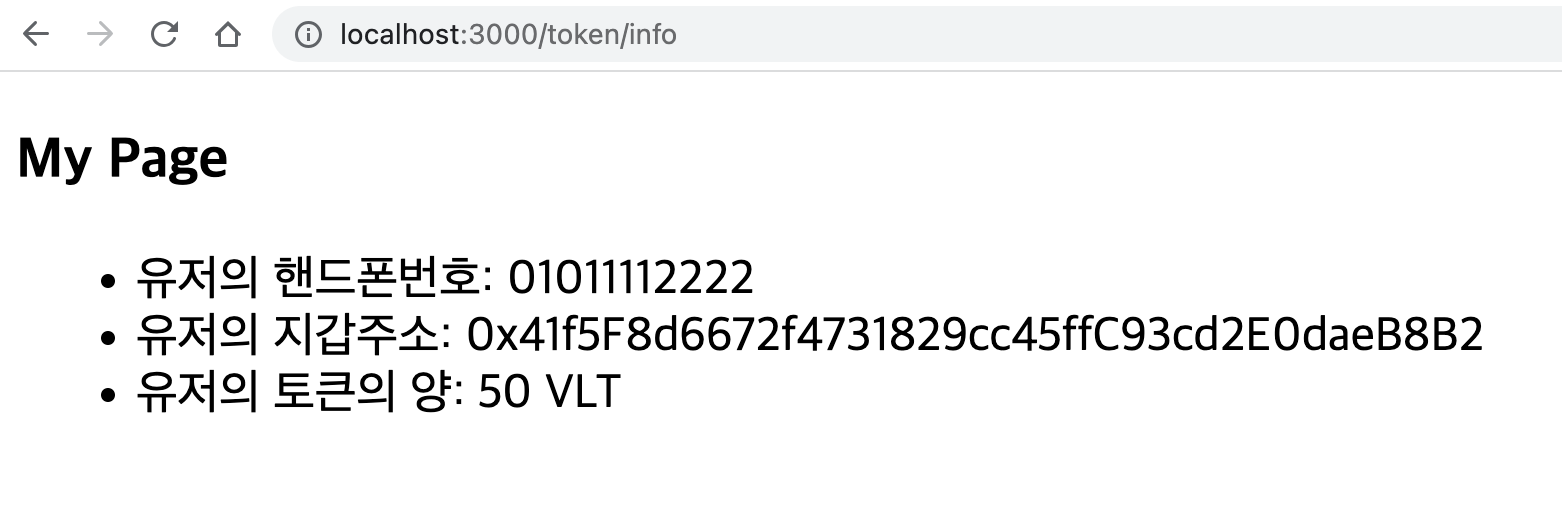 마이페이지에서는 유저의 핸드폰 번호(아이디), 지갑주소 뿐만 아니라 kip7.js에서 작성한 함수를 이용해 보유하고 있는 토큰의 양도 보여줄 것이다.