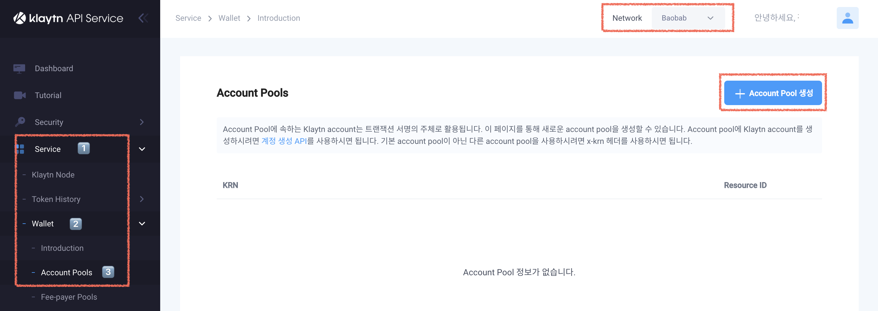 Account Pools 탭에 접속해 생성 버튼을 누르고 이름을 지정해주면 Pool이 생성된다.