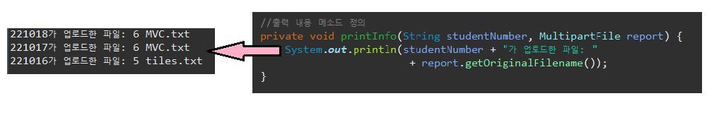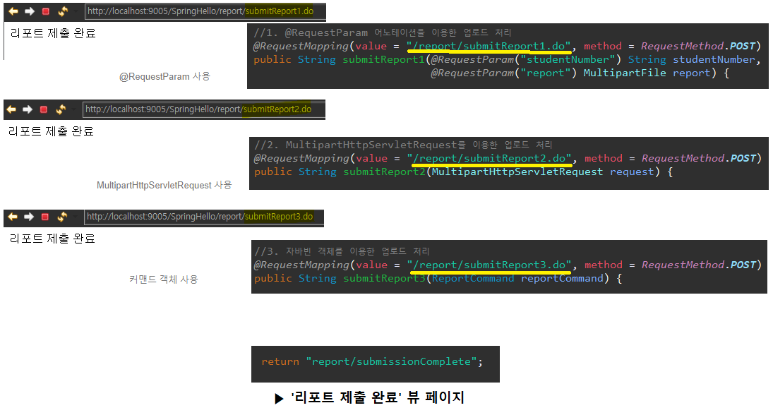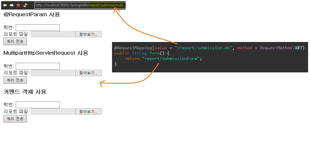 1 2 3 4 5 6 7 8 9 10 11 12 13 | import org.springframework.web.multipart.MultipartFile; import org.springframework.web.multipart.MultipartHttpServletRequest; @Controller public class ReportSubmissionController { ... @RequestMapping(value = "/report/submitReport2.do", method = RequestMethod.POST) public String submitReport2(MultipartHttpServletRequest request) { String studentNumber = request.getParameter("studentNumber"); MultipartFile report = request.getFile("report"); ... } } | cs |