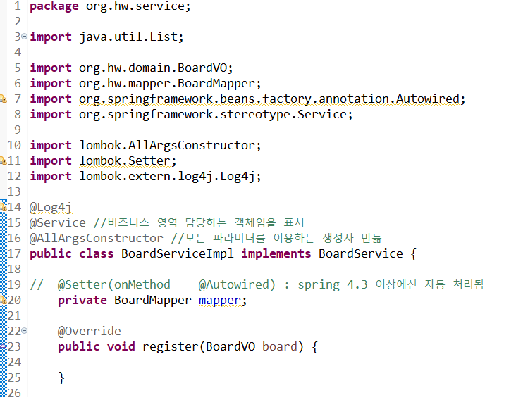 BoardServiceImpl가 정상적으로 작동하기 위해선 BoardMapper 객체가 필요하다.
