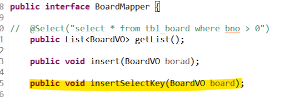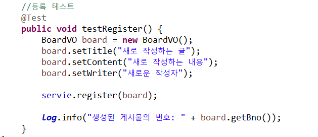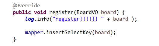 등록 작업은 BoardServiceImpl에서 파라미터로 전달되는 BoardVO 타입의 객체를 BoardMepper를 통해 처리한다.