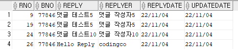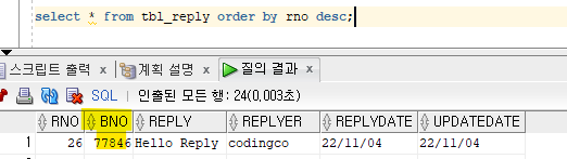 tbl_reply가 tbl_board 테이블의 bno 값과 정확히 일치해야 하므로 bno 몇 개를 확인해두는 작업