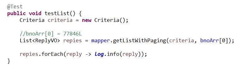 - 추가적으로 해당 게시물의 번호는 파라미터를 전달하도록 ReplyMapper 구성하기