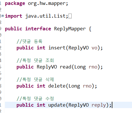 1 2 3 4 5 6 7 8 9 | package org.hw.mapper; import org.hw.domain.ReplyVO; public interface ReplyMapper { public int insert(ReplyVO vo); } | cs |
