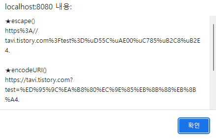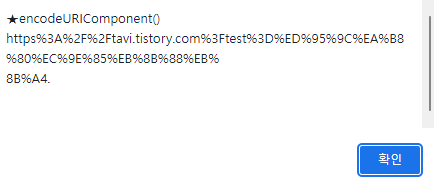 | encodeURIComponent(uriComponent) | - 알파벳과 숫자를 제외한 모든 문자 인코딩 - UTF-8 인코딩과 같음 |